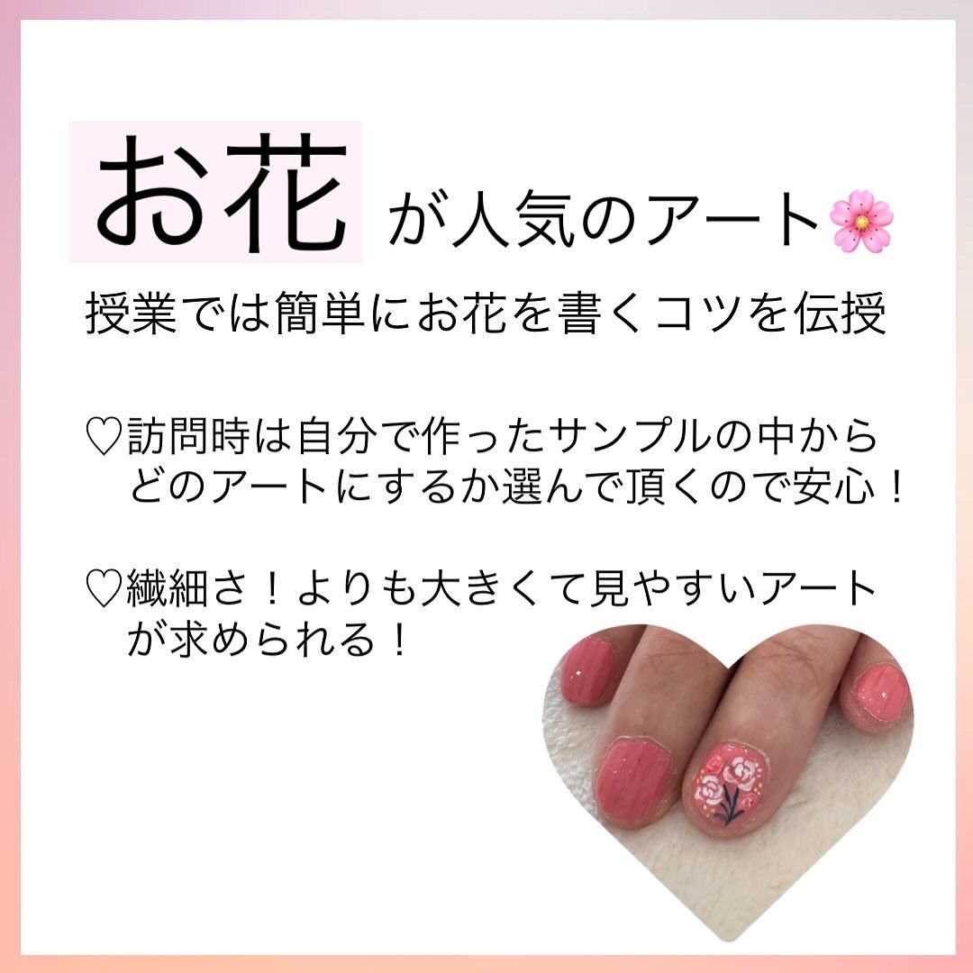 福祉ネイルってどんなアートを描くの🎨? 2025.02.17 Tweet Share +1 RSS 福祉ネイルで描くアートは 大きく見やすい絵が好まれます! その中でも1番人気はお花のアート🌸 授業内では最低でも3種類はお花を 描けるようにレクチャーします👍 卒業までにはみなさん描けるように 上達します(^^) つくば校Instagramでも活動の様子を更新中💅 ↑クリックして是非チェック✨ お問い合わせはこちら💁♀️ 茨城県つくば校 認定講師 前野美穂 📞090-6060-3713 Tweet Share +1 RSS 福祉ネイリストの年齢層😊 カリキュラムって📖?①